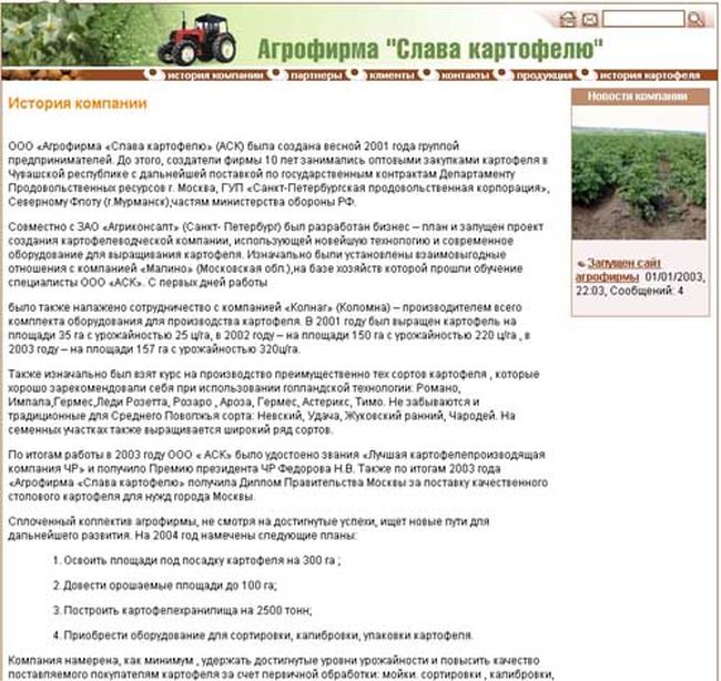 ![]() | образована Агрофирма "Слава картофелю" (2001) См. подробнее Агрофирма "Слава картофелю" – крупнейшее сельскохозяйственное предприятие в Приволжском регионе. Образована совместно с С.-Петербургской компанией "Агриконсалт" в с. Комсомольское. За короткое время существования добилась отличных результатов: вырос парк тракторов картофелеуборочных комбайнов, закуплено оборудование для сортировки и закладки картофеля в хранилище с автоматической регулировкой микроклимата. На сегодняшний день агрофирма является самым крупным производителем высококачественного семенного и продовольственного картофеля в республике по современным технологиям, начиная с 2006 г. – моркови. С 2008 г. работает по холдинговому типу, объединяет 4 агрофирмы: "Слава картофелю", "Слава картофелю – Канаш", "Слава картофелю – Яльчики", "Комсомольские овощи". Особое внимание уделяется качеству семенного материала и строгому соблюдению технологии выращивания. С целью получения высокого урожая на предприятии постоянно обновляется семенной фонд, семена закупаются в Голландии, Германии, Финляндии. Картофель, выращиваемый на полях агрофирмы, пользуется большим спросом в России и странах СНГ. Качество семенного материала подтверждено золотой медалью "За достижение высоких показателей в семеноводстве" и "Маркой качества Чувашской Республики". Агрофирме присуждено звание "Лучшая картофелепроизводящая компания Чувашской Республики". Генеральный директор агрофирмы – Хасиятулла Семигуллович Идиатуллин. Президент – Александр Петрович Капитонов. Библиография: 1) Агрофирма "Слава картофелю", 10 лет : [буклет]. - Чебоксары : [б. и.], 2011 (Типография Брындиных). - 1 л. (слож. втрое) : ил. 2) Наши семена - ваш высокий урожай! : приглашаем к сотрудничеству / Агрофирма "Слава картофелю". - Чебоксары : [б. и.], 2013 (Типография Брындиных). - [13] с. : ил. 3) Ефремова, А. Вӑрлӑх паха пулсан тухӑҫ та лайӑх / А. Ефремова // Каҫал ен. - 2021. - 13 июль/утӑ (№ 28). - С. 1-2 : сӑн ӳкерчӗк. 4) Ефремова, А. Чи паха вӑрлӑх лабораторире, унтан теплицӑра ҫитӗнет / А. Ефремова // Каҫал ен. - 2020. - 6 ноябрь/ чӳк (№ 81). - С. 1-2 : сӑн ӳкерчӗк. 5) Идиатуллин, Х. С. Хасиятулла Идиатуллин: Хамӑрӑн тавара кӑтартма, сутма пӗлмелле / Х. С. Идиатуллин ; Л. Никитина сӑн ӳкерчӗкӗ // Хыпар. - 2020. - 11 авӑн/сентябрь (№ 102/103). - С. 7 : сӑн ӳкерчӗк. 6) Клементьева, И. Таса та паха вӑрлӑхпа усӑ курсан тухӑҫ пысӑк пулать / И. Клементьева // Хыпар. - 2017. - 3 чӳк/ноябрь (№ 147/148). - С. 9 : сӑн ӳкерчӗк. 7) Листопад, Ю. Тӑван ҫӗр пилӗпе / Ю. Листопад // Хыпар. - 2009. - 19 нарӑс. - С. 2. 8) Михайлов, Ю. Тупӑш хак куҫӗнчен пӑхать / Ю. Михайлов // Хыпар. - 2024. - 5 ака/апрель (№ 35/36). - С. 7 : сӑн ӳкерчӗксем. 9) Никитина, Л. Хунавран ҫитӗнтернӗ ҫӗрулми / Л. Никитина // Хыпар. - 2023. - 3 пуш/март (№ 22/23). - С. 8 : сӑн ӳкерчӗк. 10) Паян тӑкаклӑ ӗҫлеме юрамасть / [Ю. Михайлов [т. ыт. те] хатӗрленӗ] ; С. Журавлев сӑн ӳкерчӗкӗ // Хыпар. - 2021. - 24 авӑн/сентябрь (№ 105/106). - С. 9 : сӑн ӳкерчӗксем. 11) Петрова, В. Паха вӑрлӑх - тупӑш ҫӑл куҫӗ / В. Петрова ; В. Кузьмин сӑн ӳкерчӗкӗ // Хресчен сасси. - 2020. - 11 чӳк/ноябрь (№ 43). - С. 3 : сӑн ӳкерчӗк. 12) Славин, Г. Ҫӗр улми сумӗ ан чактӑр / Г. Славин // Хыпар. - 2014. - 20 нарӑс. - С. 2 : фот. 13) Иванов, В. Картофель с громкой "Славой" / В. Иванов // Советская Чувашия. - 2012. - 2 нояб. - Прил. : с. 2 : фот. 14) Идиатуллин, Р. Х. За новыми сортами - вместе с наукой / Р. Х. Идиатуллин // Республика. - 2020. - 21 октября (№ 42). - С. 5 : фот. цв. 15) Идиатуллин, Х. С. Один за всех и все за одног