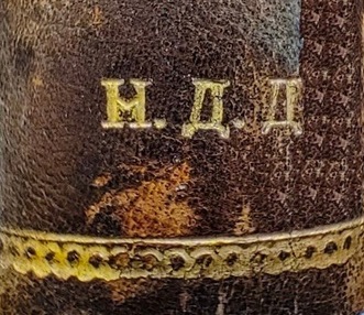 2) Суперэкслибрис на корешке, без рамки, 4х18, золотое тиснение на коже, буквенный, с инициалами «Н. Д. Д.».