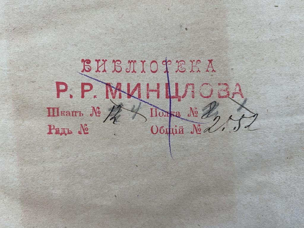 1) Штемпель, без рамки, 26×68, одноцветный (красные чернила на белой бумаге), шрифтовой, с надписью: «Библiотека| Р. Р. Минцлова| Шкапъ № Полка №| Рядъ № Общiй № ».