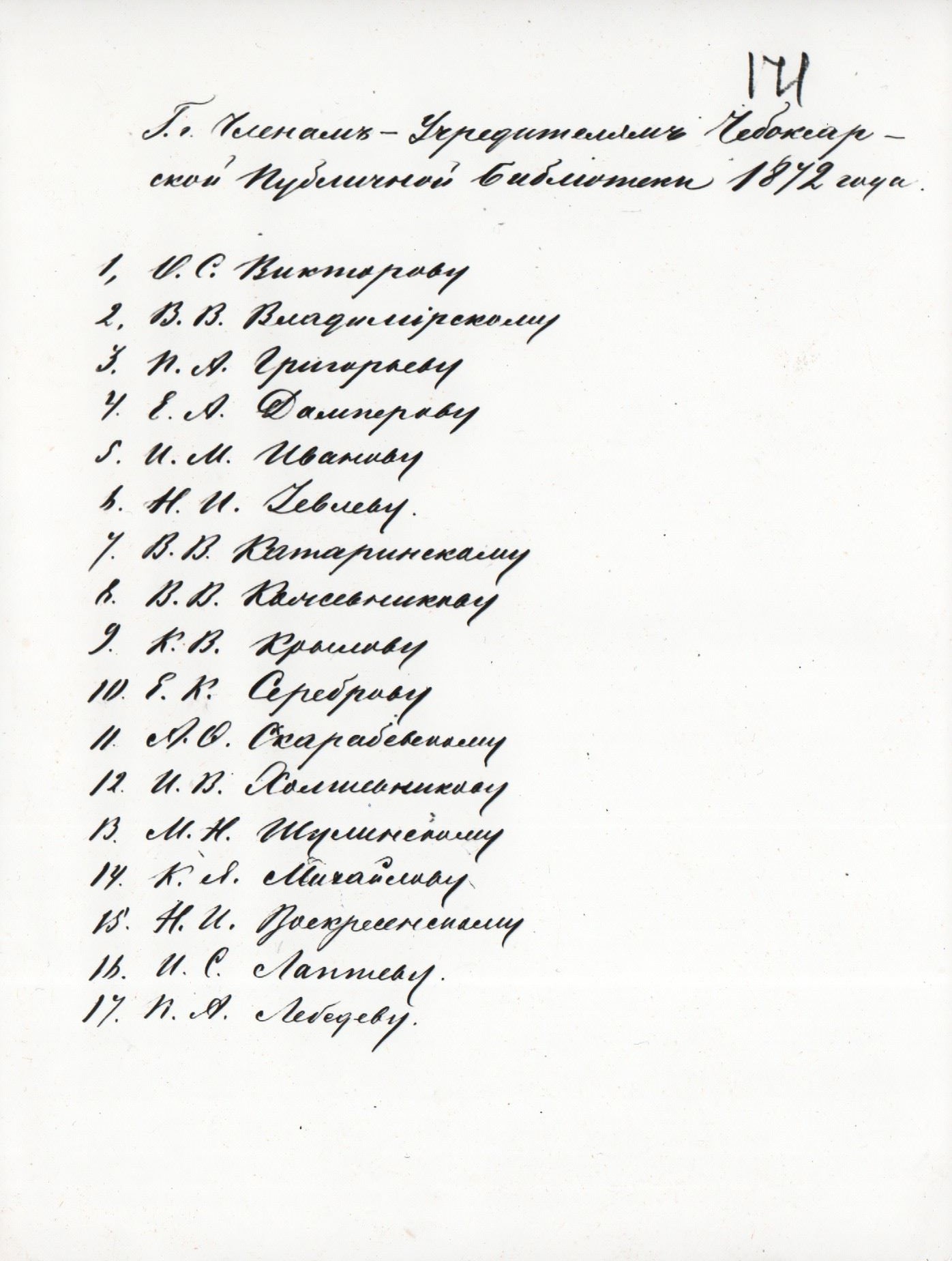 Чебоксарская городская публичная библиотека – первая уездная библиотека в Казанской губернии. 12 декабря (24 января) 1871 г. состоялось первое организационное собрание членов-учредителей (фото 0), и эту дату принято считать началом работы Чебоксарской городской публичной библиотеки (ныне – Национальная библиотека Чувашской Республики).