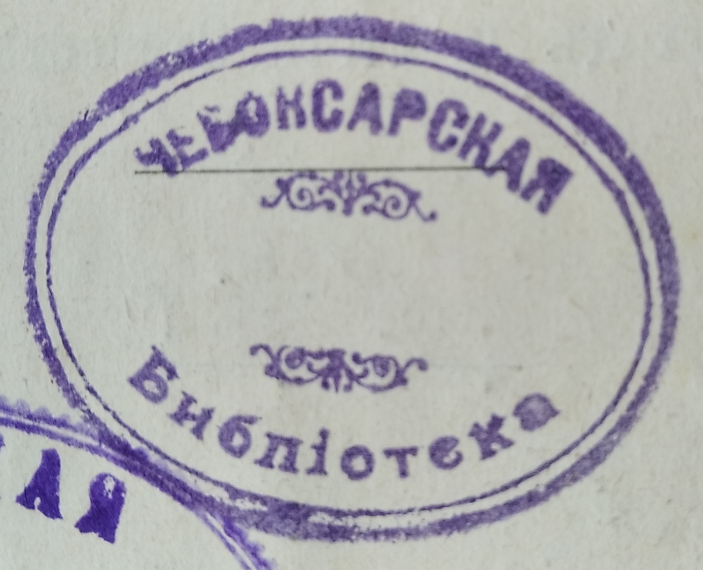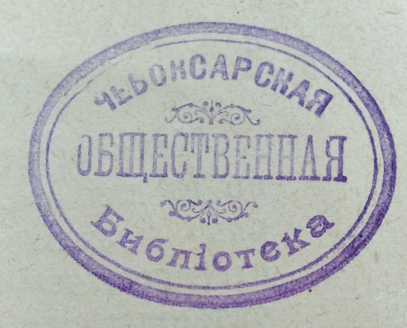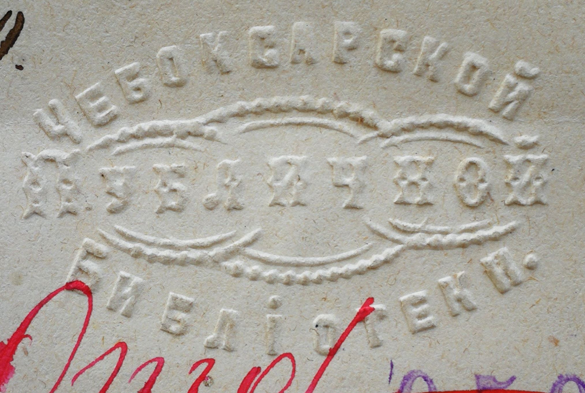 1) Штемпель, конгревное тиснение, овал, 22х31, с надписью по верхнему краю: «Чебоксарской», по центру, в обрамлении трех переплетенных звеньев: «Публичной», по нижнему краю: «Библiотеки.».