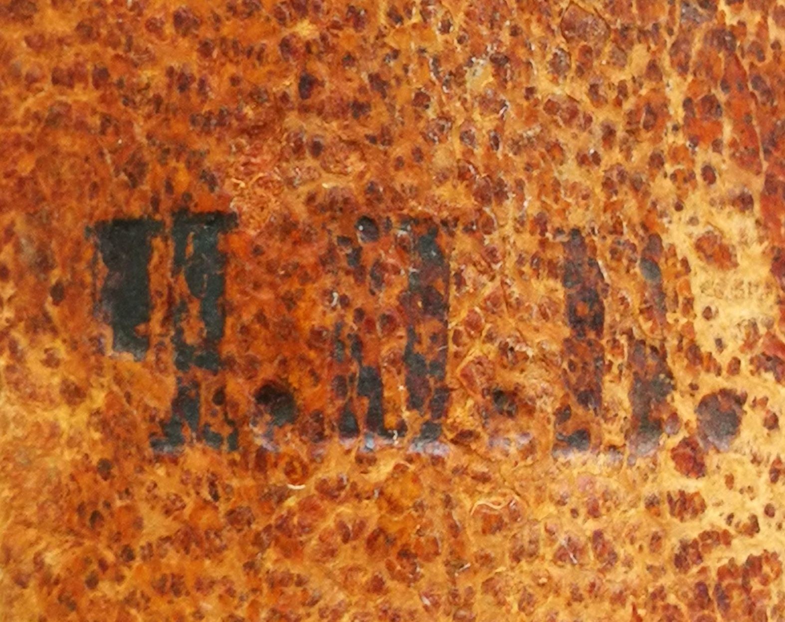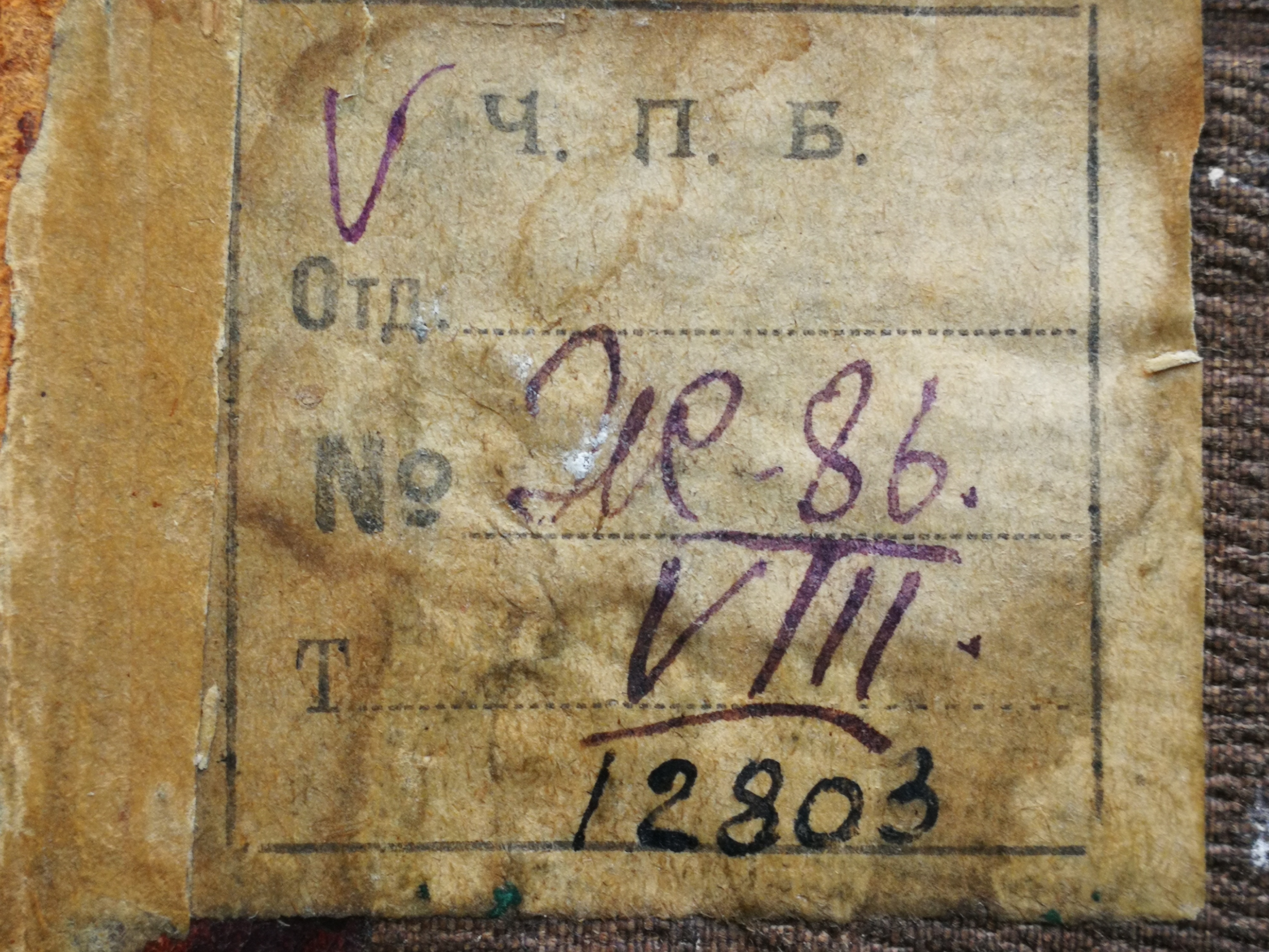 Суперэкслибрис: без рамки, 5х13, блинтовое тиснение на коже, буквенный, с надписью «Ч.П.Б.» на корешке.