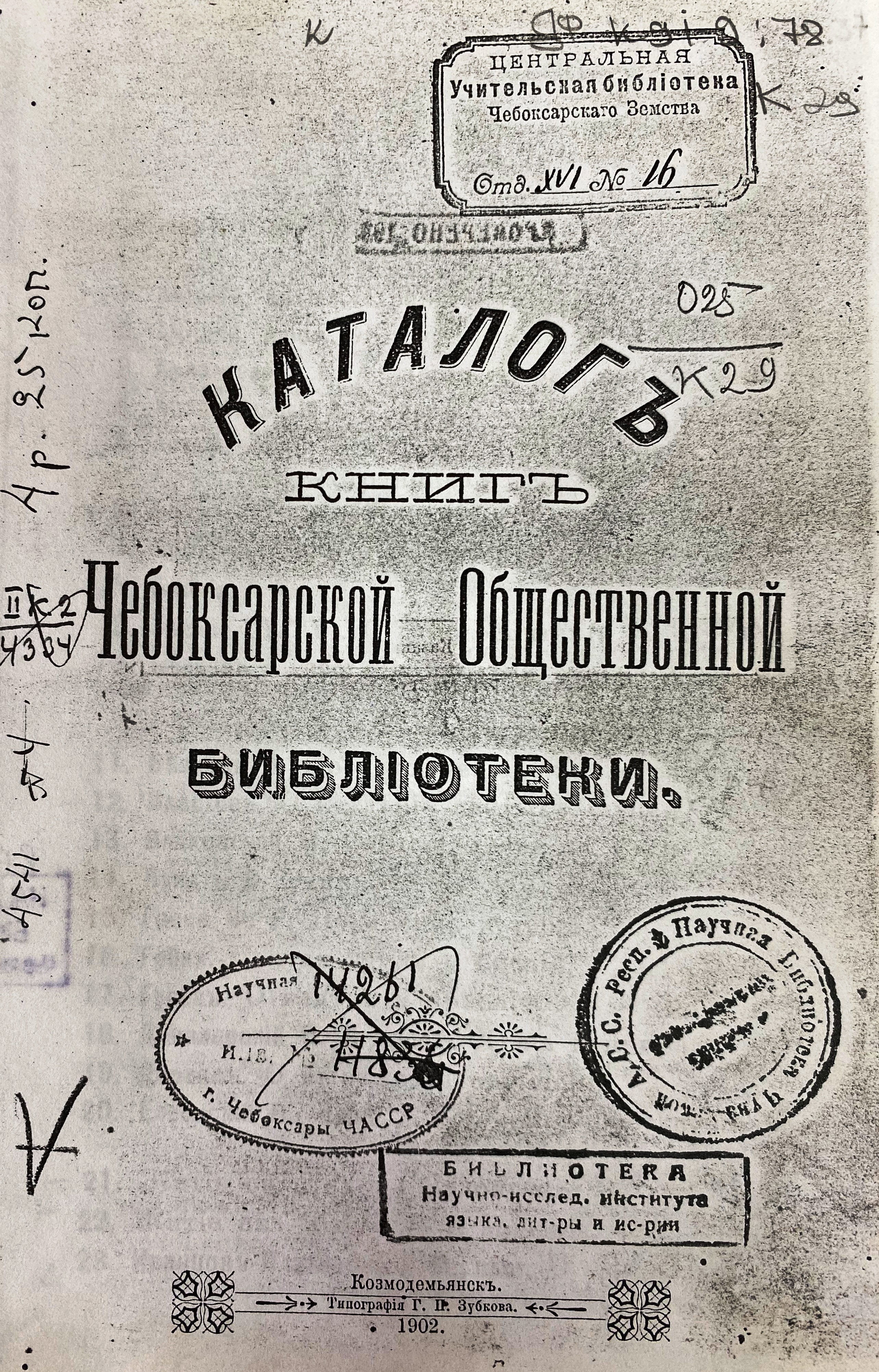 В 1902 г. вышел в свет печатный «Каталог книг Чебоксарской общественной библиотеки» (Козьмодемьянск, типография Г. П. Зубкова). В Каталоге учтено 1745 книг, 60 наименований периодических изданий. Фото 8.