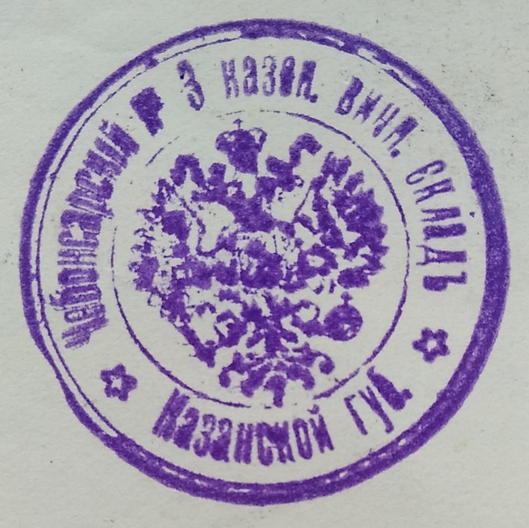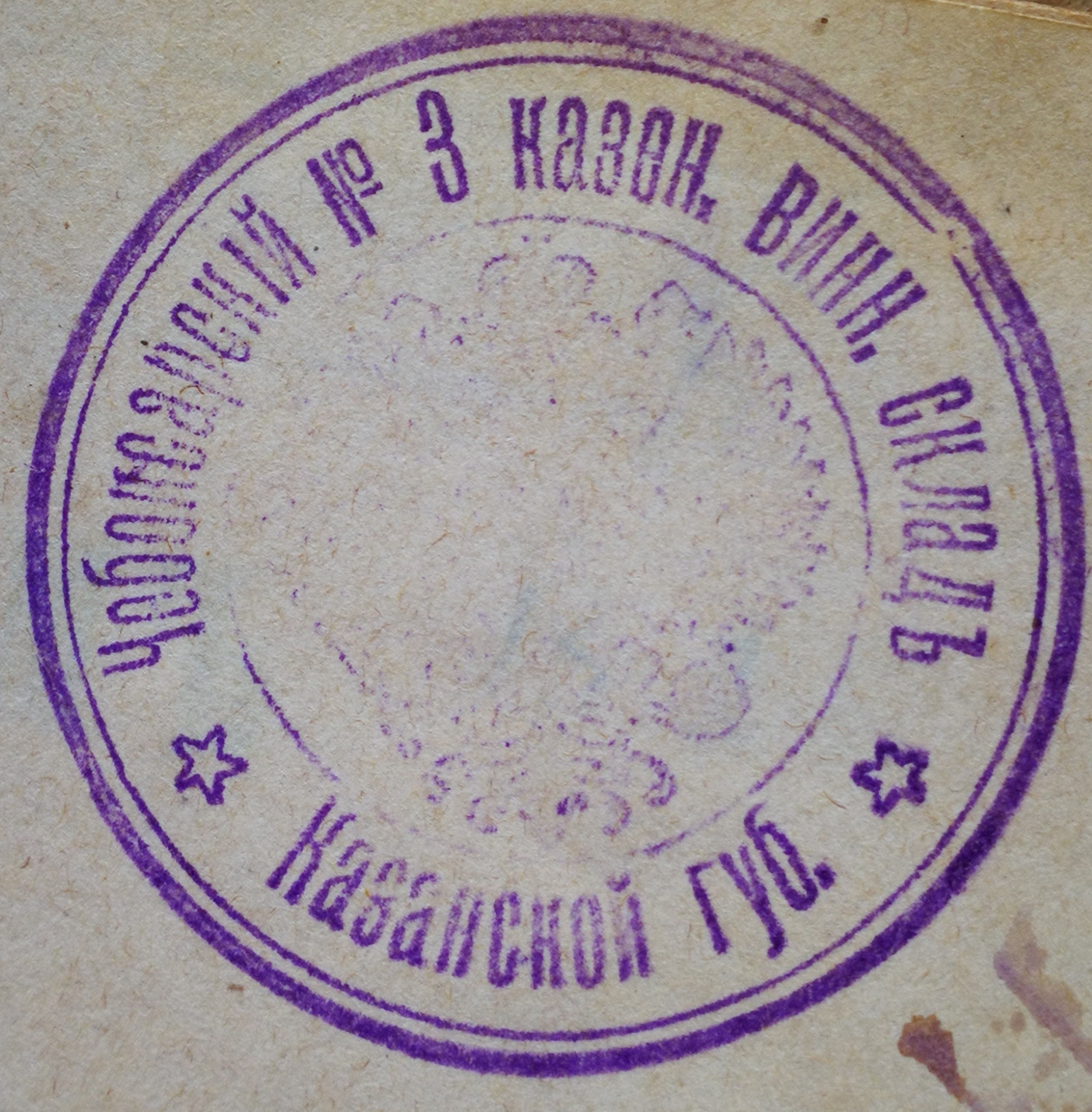 1). Штемпель, круглый, 30х30, шрифтовой, с надписью в двойной линейной рамке по окружности: «Чебоксарскiй №3 казен. винн. складъ| Казанской губ.», в центре – изображение двуглавого орла российского герба.