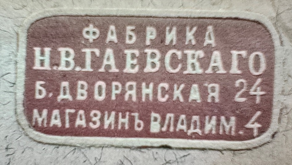 1) Бумажный ярлык, прямоугольный, с закругленными углами, 11х21, конгревное тиснение, шрифтовой, с надписью на коричневом фоне в линейной рамке по форме ярлыка: «Фабрика| Н.В. Гаевскаго| Б. Дворянская 24| магазинъ Владим. 4».