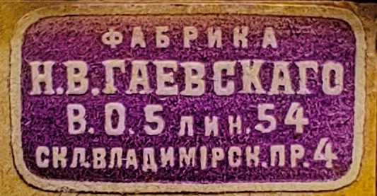 2) Бумажный ярлык, прямоугольный, с закругленными углами, 10х21, конгревное тиснение, шрифтовой, с надписью на фиолетовом фоне в линейной рамке по форме ярлыка: «Фабрика| Н.В. Гаевскаго| В.О. 5 лин.54| скл. Владимiрск. пр. 4».