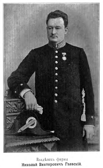 Николай Викторович Гаевский – потомственный дворянин, советник коммерции, владелец фабрики конторских книг, переплетной мастерской и типографии, один из лучших переплётчиков рубежа XIX – начала XIX вв. В 1902 г. Н. В. Гаевский награждён орденом Св. Станислава III степени по представлению Министра финансов за содействие развитию русской промышленности и торговли. До 1911 г. имел звание Поставщика Двора Его Императорского Величества.