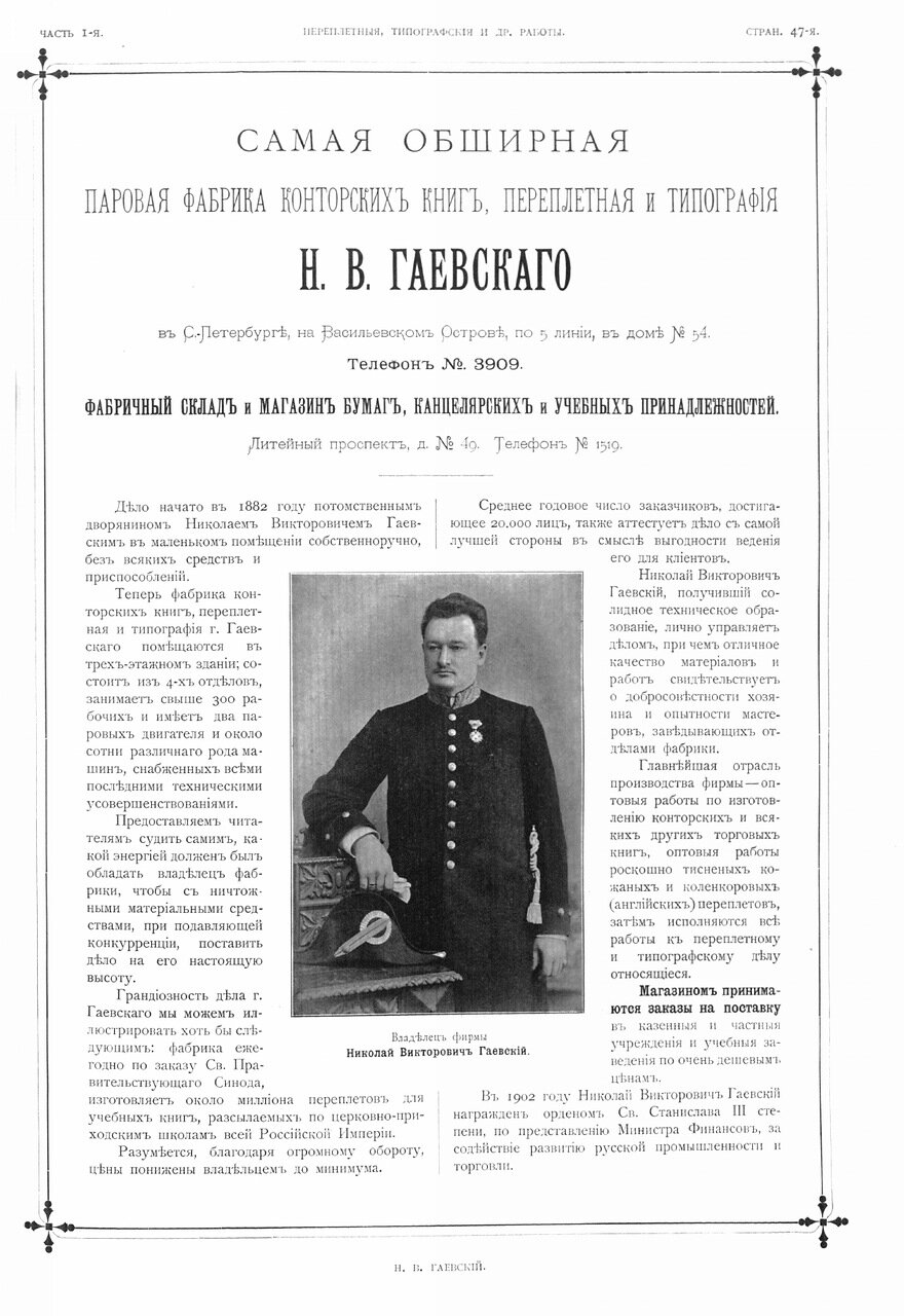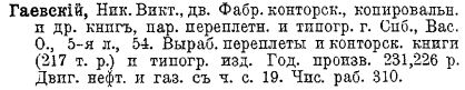 Николай Викторович Гаевский, получивший солидное техническое образование, лично управляет делом. Главная отрасль производства фирмы – оптовые работы по изготовлению конторских и всяких других торговых книг, оптовые работы роскошно тиснёных кожаных и коленкоровых (английских) переплётов, затем исполняются все работы, относящиеся к переплётному и типографскому делу» (Ч. 1, с. 47).