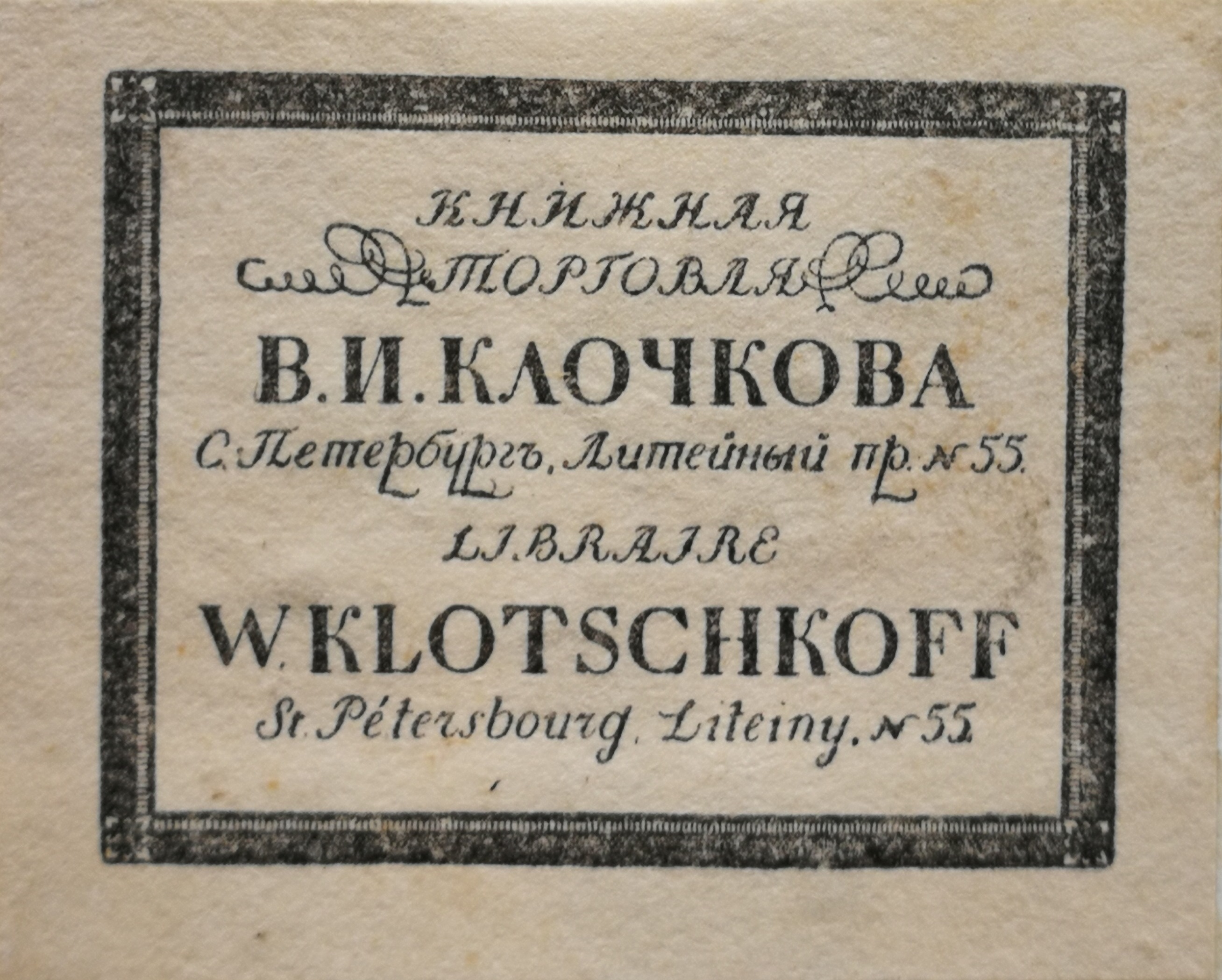 1) Бумажный ярлык, прямоугольный, 42х30, рамка 34х22, типографский, с надписью в линейной рамке: «Книжная| торговля| В. И. Клочков| С. Петербург. Литейный пр. №55| Libraire| W. Klotschhkoff| Sc.Petersbourg. Liteiny. №55»