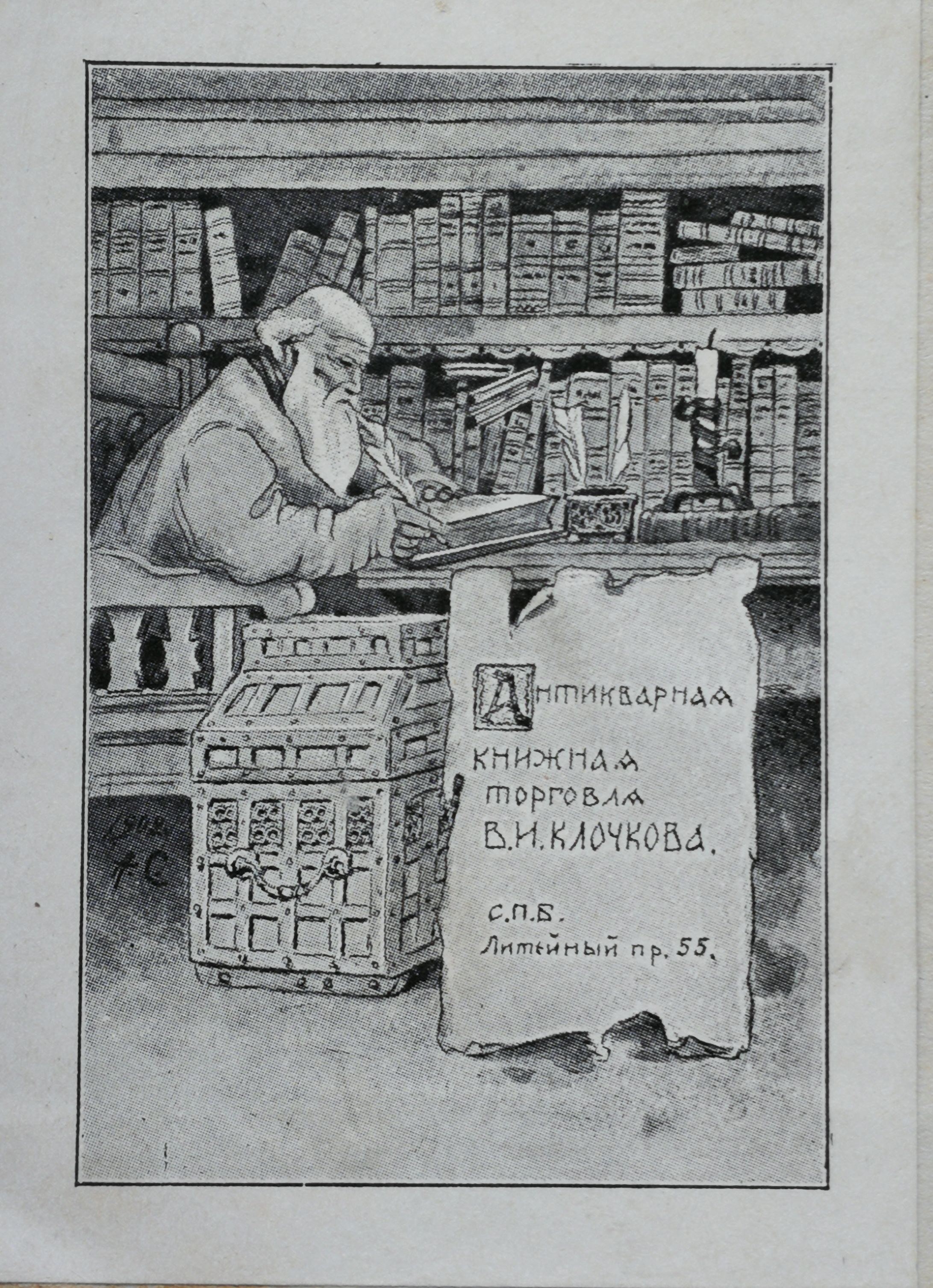 2) Бумажный ярлык, прямоугольный, 77х55, рамка 67х45, литография, одноцветный, сюжетный, с изображением в линейной рамке на фоне книжных полок подьячего, сидящего за столом над раскрытой книгой с пером в правой руке, пред ним – чернильница, далее – горящая свеча; на переднем плане ларец, справа от которого в рамке, стилизованной под лист с неровными и оборванными краями надпись: «Антикварная| книжная| торговля| В.И. Клочкова.| С.П.Б.| Литейный пр., 55.». В тени кресла писца, слева от ларца, надпись с указанием даты создания книжного знака и инициалов художника: «1902| А. С.».