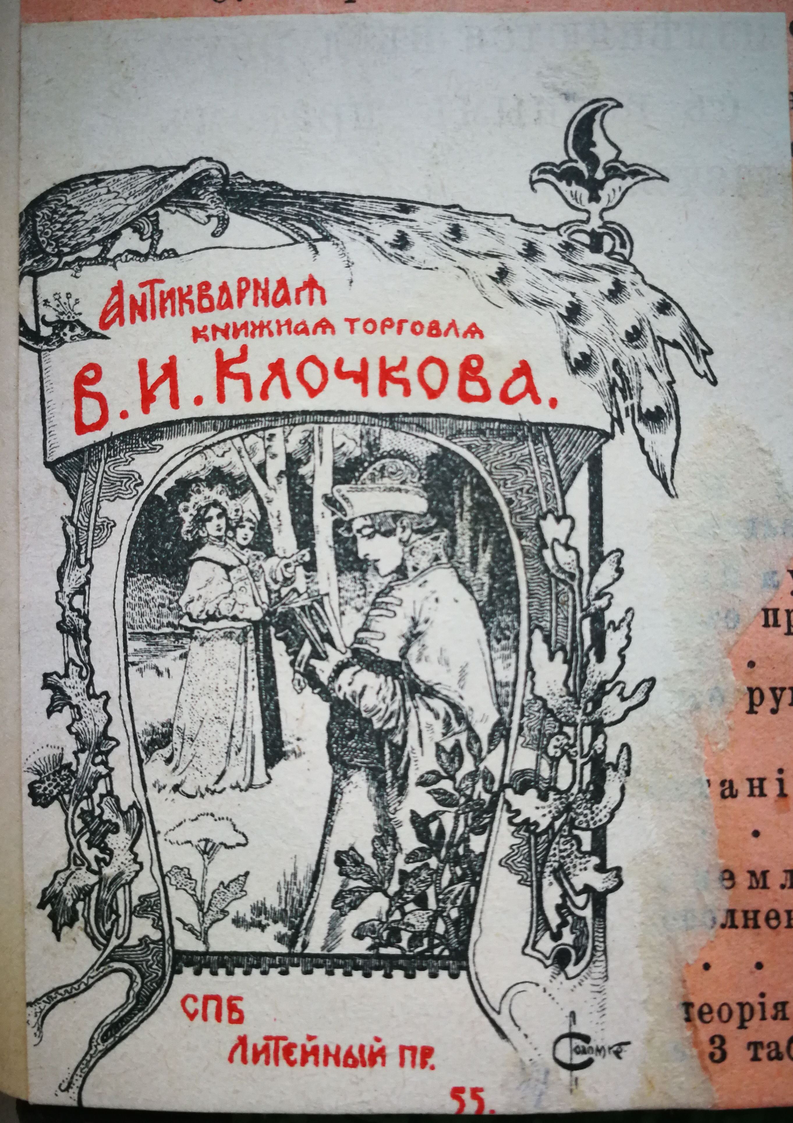 3) Бумажный ярлык, прямоугольный, без рамки, 65х50, литография, многоцветный (черный, серый, красный), сюжетный, в древнерусском стиле, с изображением на переднем плане мужчины в кафтане и шапке, читающего книгу, на заднем плане – двух женских фигур, деревьев, цветов, сверху – павлина, с надписью: «Антикварная| книжная торговля| В.И. Клочкова.| СПБ| Литейный пр.| 55.»; в нижнем правом углу: «Соломко».