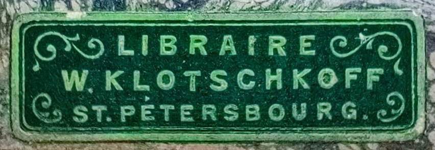 4) Бумажный ярлык, прямоугольный, с закругленными углами, 10х32, конгревное тиснение, шрифтовой, с надписью на зеленом фоне в двойной линейной рамке между виньетками: «Libraire| W. Klotschhkoff| St. Petersbourg.».