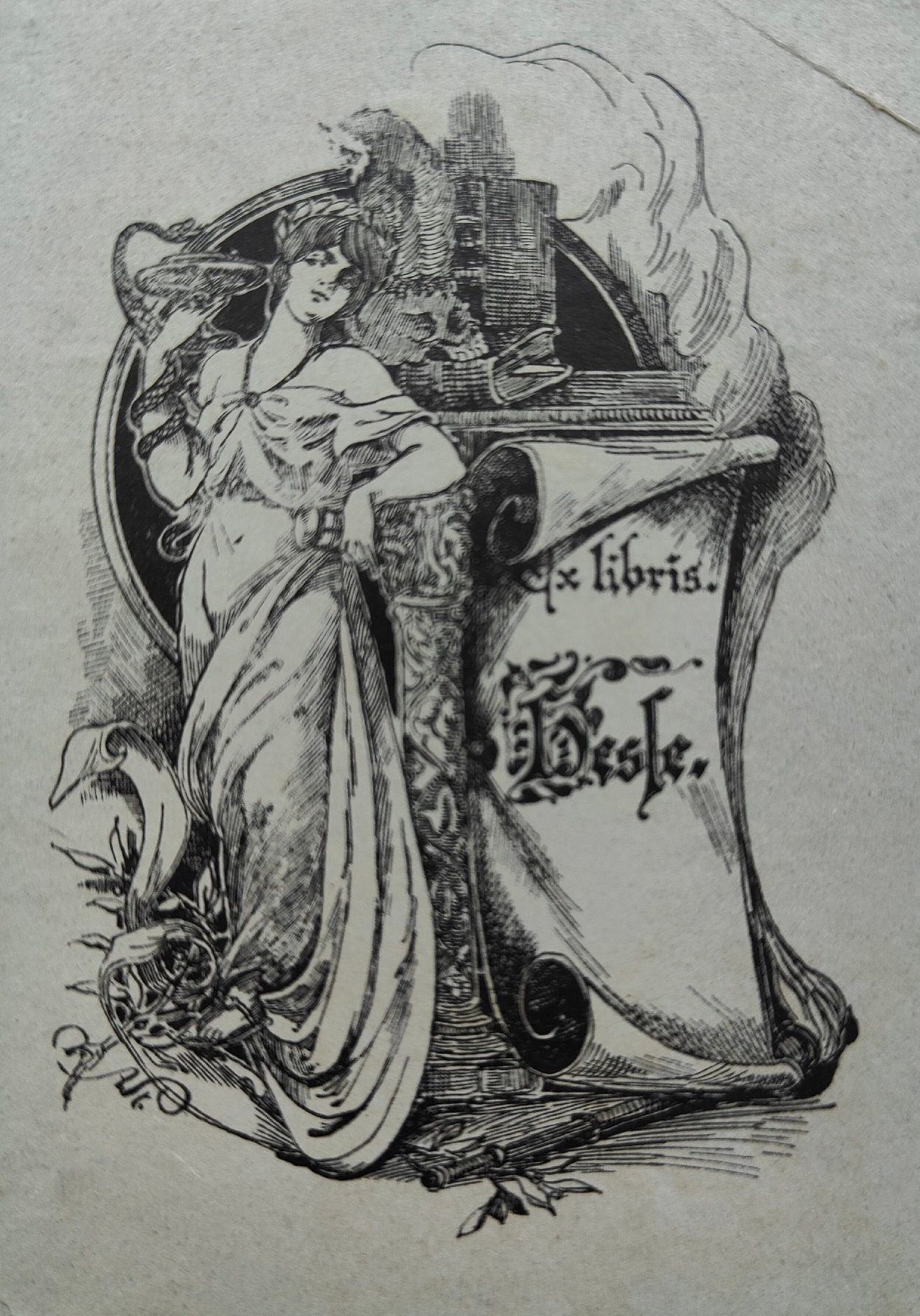 Бумажный ярлык, прямоугольный, 89х61, по изображению 78х54, сюжетный, с изображением фигуры девушки в древнегреческом хитоне, опирающейся согнутой в локте левой рукой на резную колонну. В правой, согнутой в локте, руке девушки, обвитой змеей, – чаша; на голове – венок, рядом с правой ногой, обутой в сандалию, цветок и вензелевые инициалы (видимо, художника): «АН», под колонной – меч в ножнах; справа за спиной, на полке – сова на человеческом черепе и книги, ниже – на раскрытом свитке надпись: «Еx| libris.| Hesle.», инициал «Н» оформлен в растительном стиле.