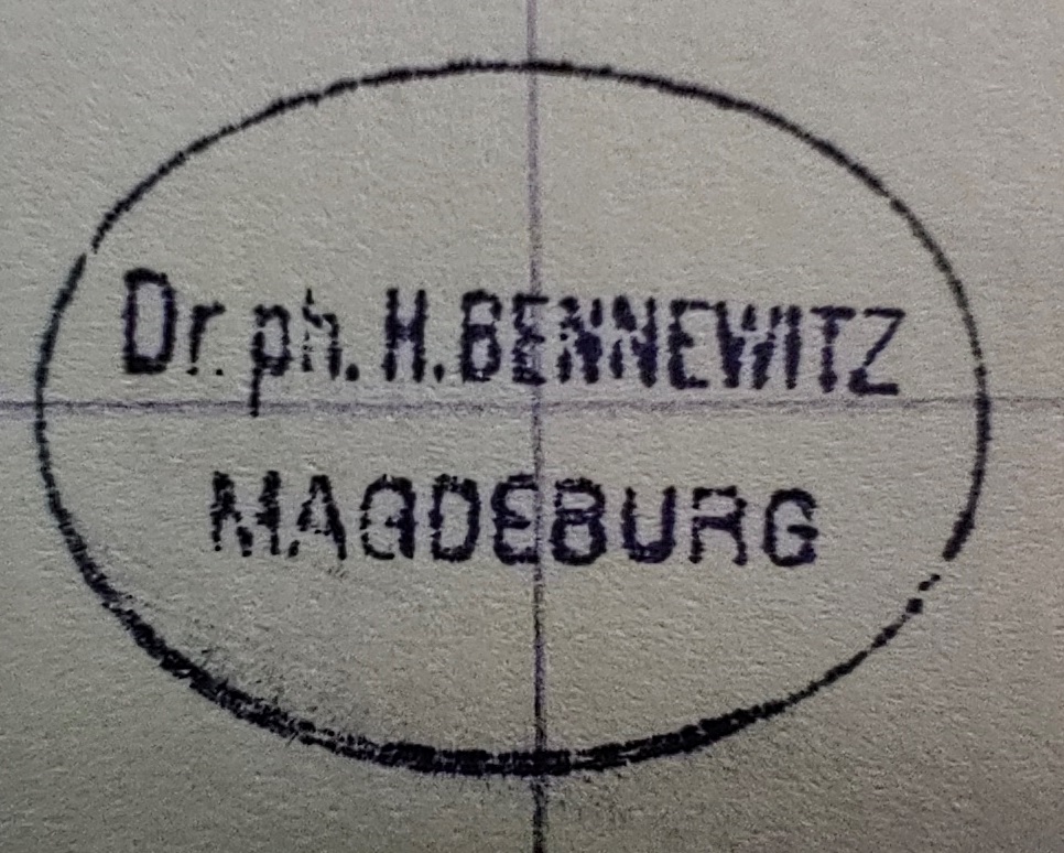 Штемпель, овальный, 19х25, шрифтовой, с надписью в линейной рамке: «Dr.ph. H. Bennewitz| Magdeburg».
