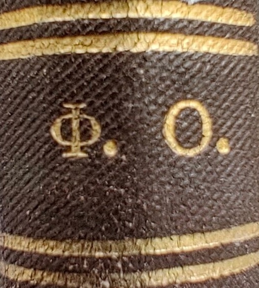 Суперэкслибрис на корешке, без рамки, 3х10, золотое тиснение на коже, буквенный, с инициалами «Ф. О.».