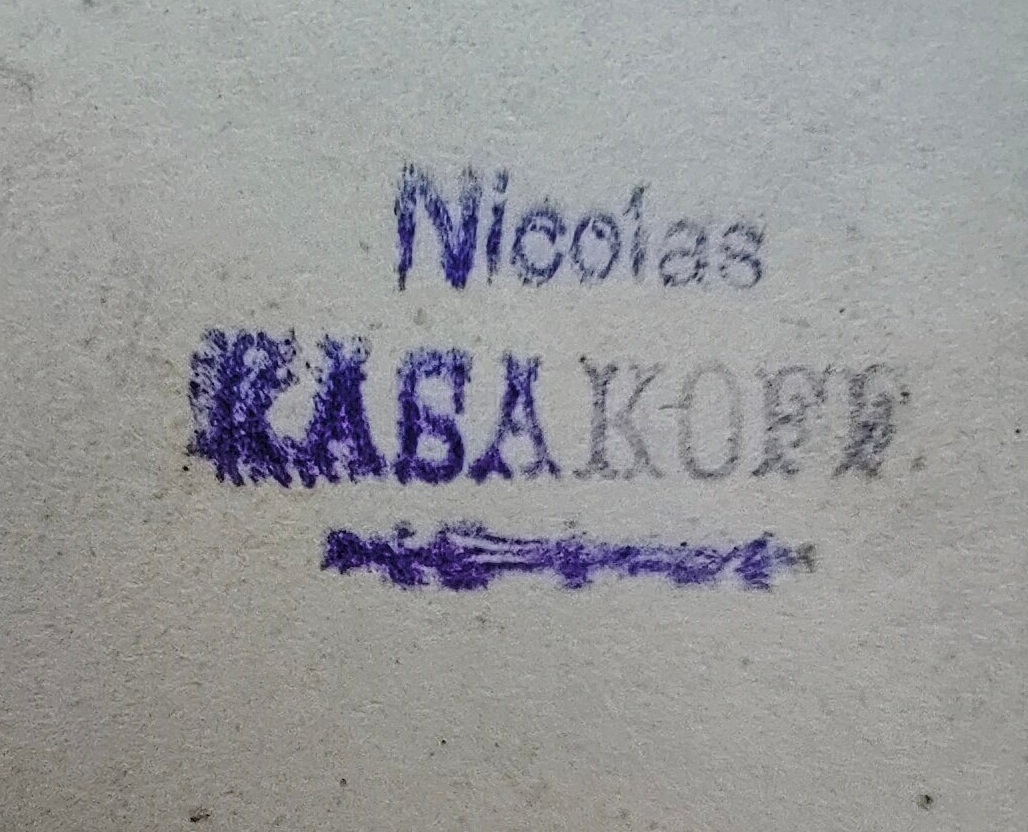 Штемпель, без рамки, 12х21, шрифтовой, с надписью над виньеткой: «Nicolas| Kaбакоff.».