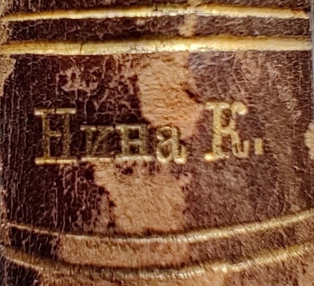 Суперэслибрис на корешке, без рамки, 3х14, золотое тиснение на коже, шрифтовой, с надписью: «Нина К.».