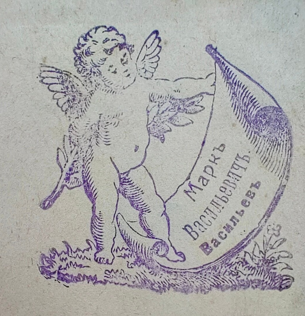 Штемпель, без рамки, по изображению 33х33, оттиск синей краской на бумаге, сюжетный, с изображением ангелочка, правой рукой держащего за спиной оливковую ветвь, а левой рукой и левой ногой – свиток с надписью: «Маркъ| Васильевичъ| Васильевъ».
