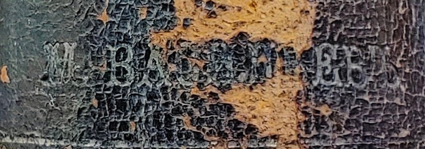 Суперэкслибрис на корешке, без рамки, 3х30, золотое тиснение на коже, шрифтовой, с надписью «М. Васильевъ».