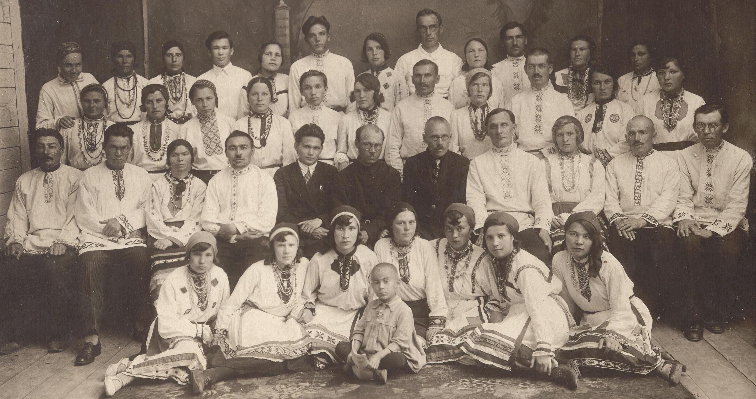 Чувашский государственный хор. 1934 г. 6 июля. В центре сидит помощник дирижера Ф.М. Лукин, директор Музыкального техникума Г.Г. Лисков, дирижер В.П. Воробьев. |
