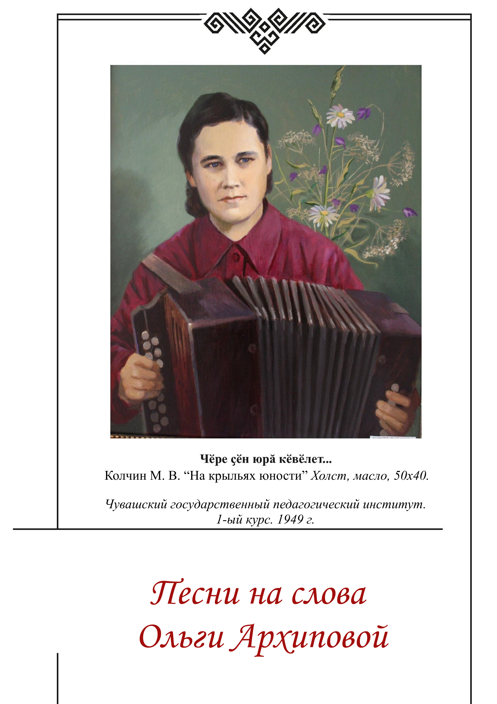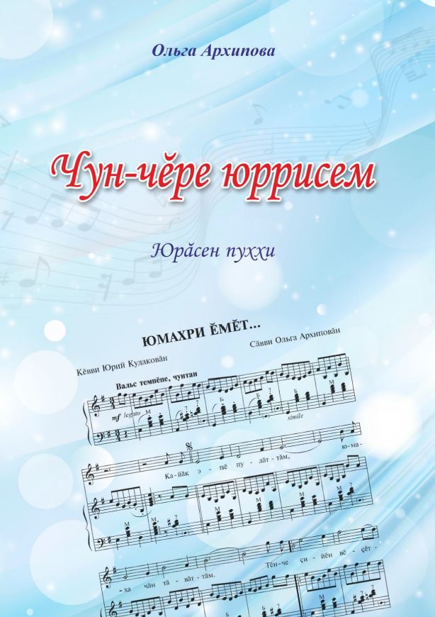 Архипова, О. А. Чун-чӗре юррисем : юрӑсен пуххи : пӗччен тата хорпа юрламалли юрӑсем/ О. Архипова ; составители: М. Ю. Севастьянов, В. С. Архипова. - Чебоксары, 2020. - 115 с. - Перевод загл: Мелодии души и сердца : песни для сольного и хорового исполнения.