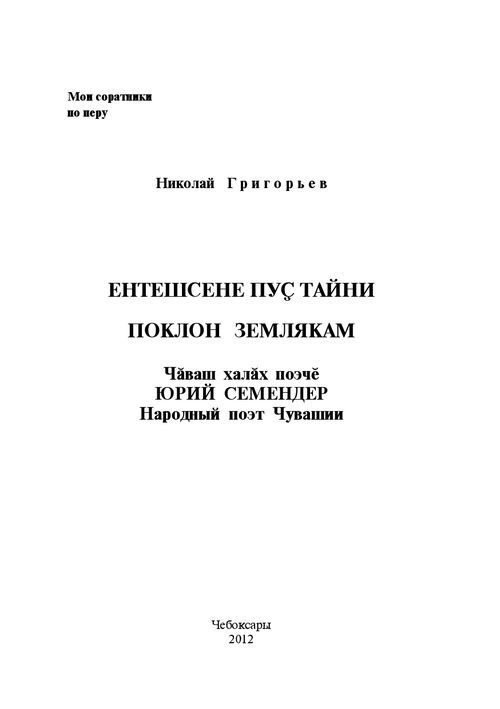 Ентешсене пуҫ тайни : чӑваш халӑх поэчӗ Юрий Семендер : [очерксем, юрӑсем, сӑвӑсем] = Поклон землякам : народный поэт Чувашии Юрий Семендер / Н. Григорьев [пухса хатӗрленӗ]. - Чебоксары : [Новое Время], 2012. - 558 с., [15] л. ил. : ил., портр.