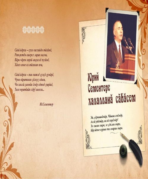 Публикации в коллективных сборниках и периодических изданиях на чувашском языке Антонов, Л. "Уҫса яр-ха, Танӑш, хапхуна..." : Юрий Сементере 80 ҫул тултарнӑ ятпа чунтан саламласа : [сӑвӑ] / Л. Антонов // Ял пурнӑҫӗ (Красноармейски районӗ). - 2021. - 21 кӑрлач (№ 2). - С. 10. Асамат, С. Пĕлес пулсан : Юрий Сементере : [сăвă] / Светлана Асамат // Тăван Атăл. – 2000. – № 3. – С. 16-17. Асамат, С. Чӑваш халӑх поэтне Юрий Сементере : [сӑвӑсем] / С. Асамат // Канаш (Ульяновск облаҫӗ). - 2011. - 15 авӑн (№ 37). - С. 6. Ашкеров, В. Эх, Сементер... : Юрий Сементер 70 ҫул тултарчӗ : [сӑвӑ] / В. Ашкеров // Канаш (Ульяновск облаҫӗ). - 2011. - 6 кӑрлач (№ 1). - С. 8. Васильева, Е. Юратнӑ поэтӑм : [сӑвӑ] / Е. Васильева // Ял пурнӑҫӗ (Красноармейски районӗ). - 2022. - 12 ҫу/май (№ 18). - С. 9. Дубров, Г. Яту юлĕ халăхра : хамăр ентеше – Юрий Сементере – савса, чысласа : [сăвă] / Гурий Дубров // Çилçунат. – 2000. – № 1-2. – С. 28. – ("Çилçунат" кĕнеки). Ершов-Янгер, Н. Анчах эпир те çамрăкчĕ… : [Юрий Семенов-Сементер сăвăçа саламласа сăвă] / Н. Ершов-Янгер // Ял пурнăçĕ (Красноармейски районĕ). – 1996. –18 кăрлач. Ершов, Н. Талантупа пурне те тӗлӗнтер : [сӑвӑ] / Н. Ершов // Ял пурнӑҫӗ (Красноармейски районӗ). - 2015. - 25 авӑн (№ 73). - С. 7. Ершов, Н.. Тӑван кӗтес парни : [Юрий Сементере халалланӑ сӑвӑ] / Н. Ершов // Ял пурнӑҫӗ (Красноармейски районӗ). - 2015. - 13 нарӑс (№ 10). - С. 8. Ефимов, Г. "Пулмасассăн санăн пахчунта…" : сăвă : Ю. С. Сементере / Г. Ефимов // Чăваш ен. – 1998. – 1-8 авг. (№ 30). – С. 5. Зимин, Н. Ватӑлмасӑр ҫыр, ан ывӑн... : [Юрий Сементере халалланӑ сӑвӑ] / Н. Зимин // Сувар (Тутарстан Республики). - 2021. - 15 кӑрлач/январь (№ 1). - С. 9. Казанов, А. Çĕклентер те хĕмлентер : Юрий Сементере : [сăвă] / Аркадий Казанов // Хыпар. – 2007. – 11 ака. Кузнецов, Г. Танӑш : Чӑваш халӑх поэтне Юрий Сементере : [сӑвӑ] / Г. Кузнецов // Ял пурнӑҫӗ (Красноармейски районӗ). - 2021. - 21 кӑрлач (№ 2). - С. 10. Минуллин, Р. Сан яту урлах иртетпĕр : [сăвă] / Р. Минуллин ; В. Ахун куçарнă // Хыпар. – 1997. – 3 çĕртме. Петровский-Теветкел, Н. Çĕршыв ачи : Юрий Сементере : сăвă / Н. Петровский-Теветкел // Ял пурнăçĕ (Красноармейски р-нĕ). – 1996. – 25 янв. Романов, Б. Кармашăн-и е ăнтăлăн : [сăвă] / Б. Романов // Тăван Атăл. – 1997. – № 1. – С. 62. Тимофеев-Ыхра, А. Юрий Сементере : [сăвă] / А. Тимофеев-Ыхра // Тăван Атăл. – 2008. – № 5. – С. 43. Туктар, В. Поэт чӗри : Юрий Сементере : [сӑвӑ] / В. Туктар // Шурӑмпуҫ : Татарстанти чӑваш ҫыравҫисен журналӗ. - 2021. - № 8 (чӳк). - С. 84 : сӑн ӳкерчӗк. Тусли, Г. Юрий Сементере : сăвă / Г. Тусли // Ял пурнăçĕ (Красноармейски р-нĕ). – 1996. – 25 янв. Ункай, Н. "Эс ҫуралнӑ кун паян..." : чӑваш халӑх поэтне Юрий Сементере : [сӑвӑ] / Н. Ункай // Ял пурнӑҫӗ (Красноармейски районӗ). - 2015. - 31 пуш (№ 23). - С. 7. Шетмĕ, М. Майне пĕлсе вĕрет-ши çилĕ? : [сăвă : Юрий Сементер поэта, сума суса, ырă сунса] / Михали Шетмĕ // Ял пурнăçĕ (Красноармейски районĕ). – 1996. –18 кăрлач. Эреш, Ҫемен. "Мӗскер вӑл чап? Мӗнпе ӑна виҫеҫҫӗ?." : [чӑваш халӑх поэтне Юрий Сементере халалланӑ сӑвӑ] / Ҫемен Эреш // Ял пурнӑҫӗ (Красноармейски районӗ). - 2015. - 31 пуш (№ 23). - С. 7. Эреш, Ҫемен. Поэзи! Муза! Йӳҫӗ! Йӳҫӗ : [Юрий Сементере халалланӑ сӑвӑ] / Ҫемен Эреш // Ял пурнӑҫӗ (Красноармейски районӗ). - 2016. - 26 кӑрлач (№ 5). - С. 1. Юмарт, Г. Кӗҫӗн Шетмӗ сӑвӑҫне : [сӑвӑ] / Г. Юмарт // Ял пурнӑҫӗ (Красноармейски районӗ). - 2017. - 22 авӑн (№ 70). - С. 8. Юмарт, Г. Юрий Сементере : [сăвă] / Г. Юмарт // Ял пурнăçĕ (Красноармейски р-нĕ). – 1999. – 23 кăрлач. – ("Ял пурнăçĕ" кĕнеки ; № 6). Янгер, Н. Талантупа пурне те тӗлӗнтер : чӑваш халӑх поэтне Юрий Сементере : [сӑвӑ] / Н. Янгер ; А. Плеханов ӳкерч